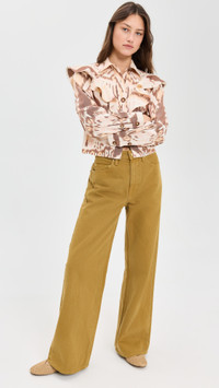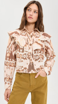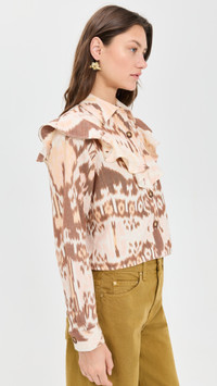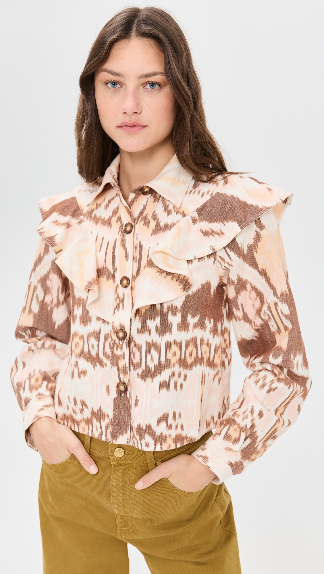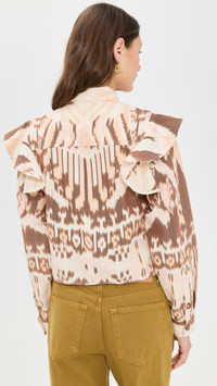 - Fabric: Lightweight, non-stretch weave - Ikat pattern - Ruffle trim at yoke - Collared neck - Long sleeves with button cuffs - Button placket - Shell: 100% cotton - Hand wash - Imported, India Style #ULLAJ23176