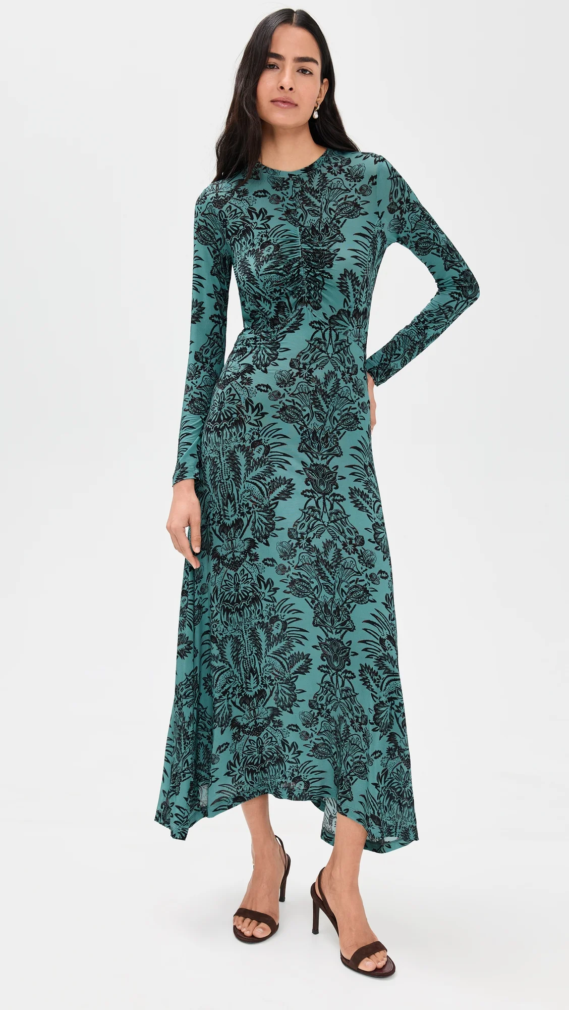 - Fabric: Lightweight, super-stretch tricot jersey - Ruched seam at front - Floral print - Midi length - Crew neck - Long sleeves - Pullover design, no closure - Shell: 91% rayon/9% elastane - Unlined - Wash warm - Imported, Turkey Style #ULLAJ23377