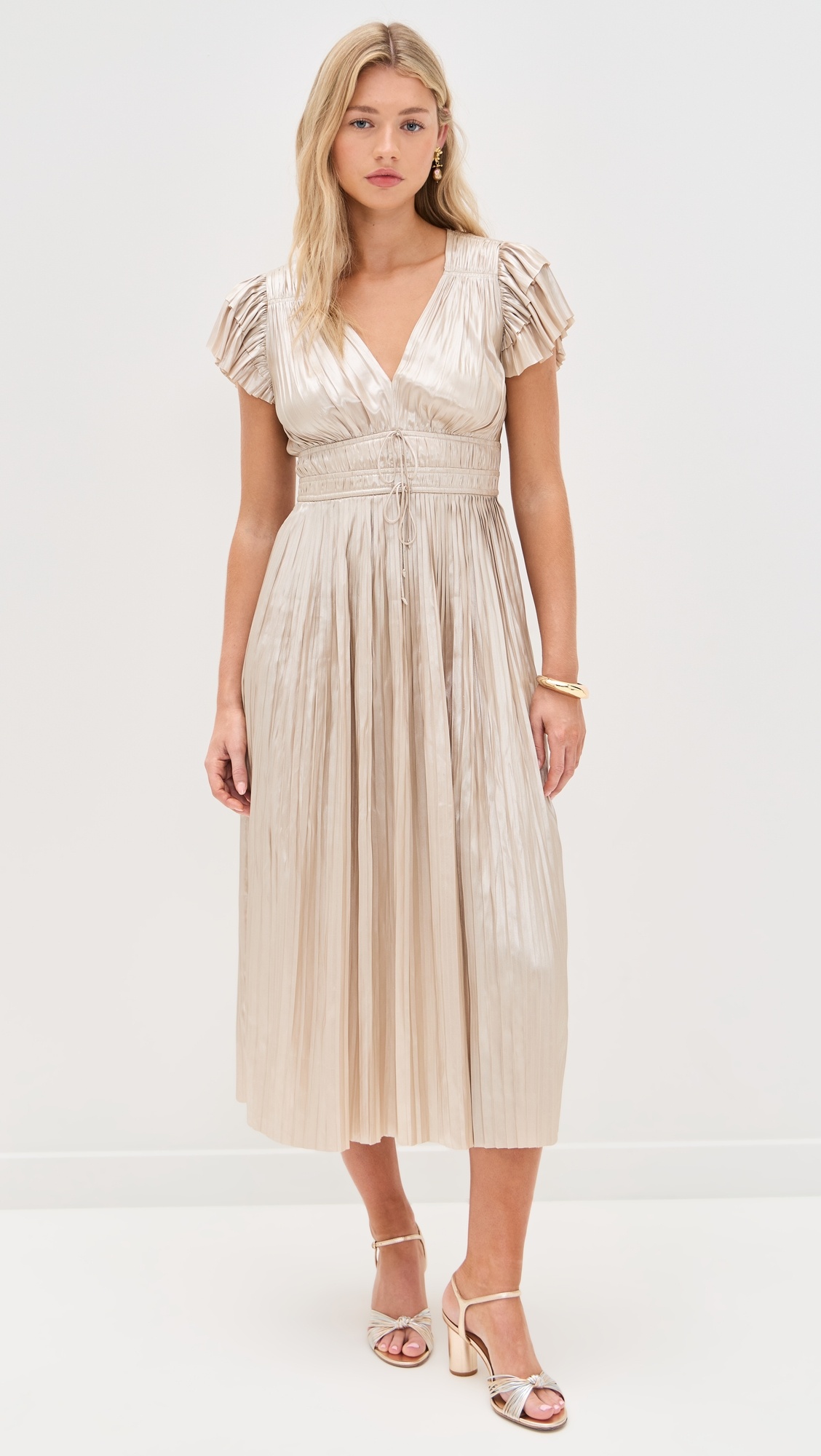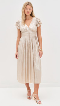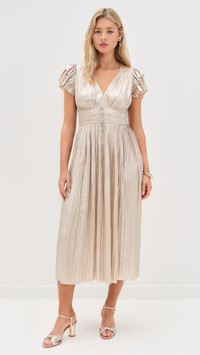 - Fabric: Lightweight, non-stretch plisse satin - Tiered sleeves - Midi length - V neck - Short flutter sleeves - Hook-and-eye and hidden zip at side - Drawstring waist - Shell: 100% polyester - Unlined - Dry clean - Imported, China Style #ULLAJ23195 Size & Fit Model measurements: Size 2: Lola (5'8") usually wears size 2 Measurements from size 2 Length: 48.5in / 123.0cm, from shoulder