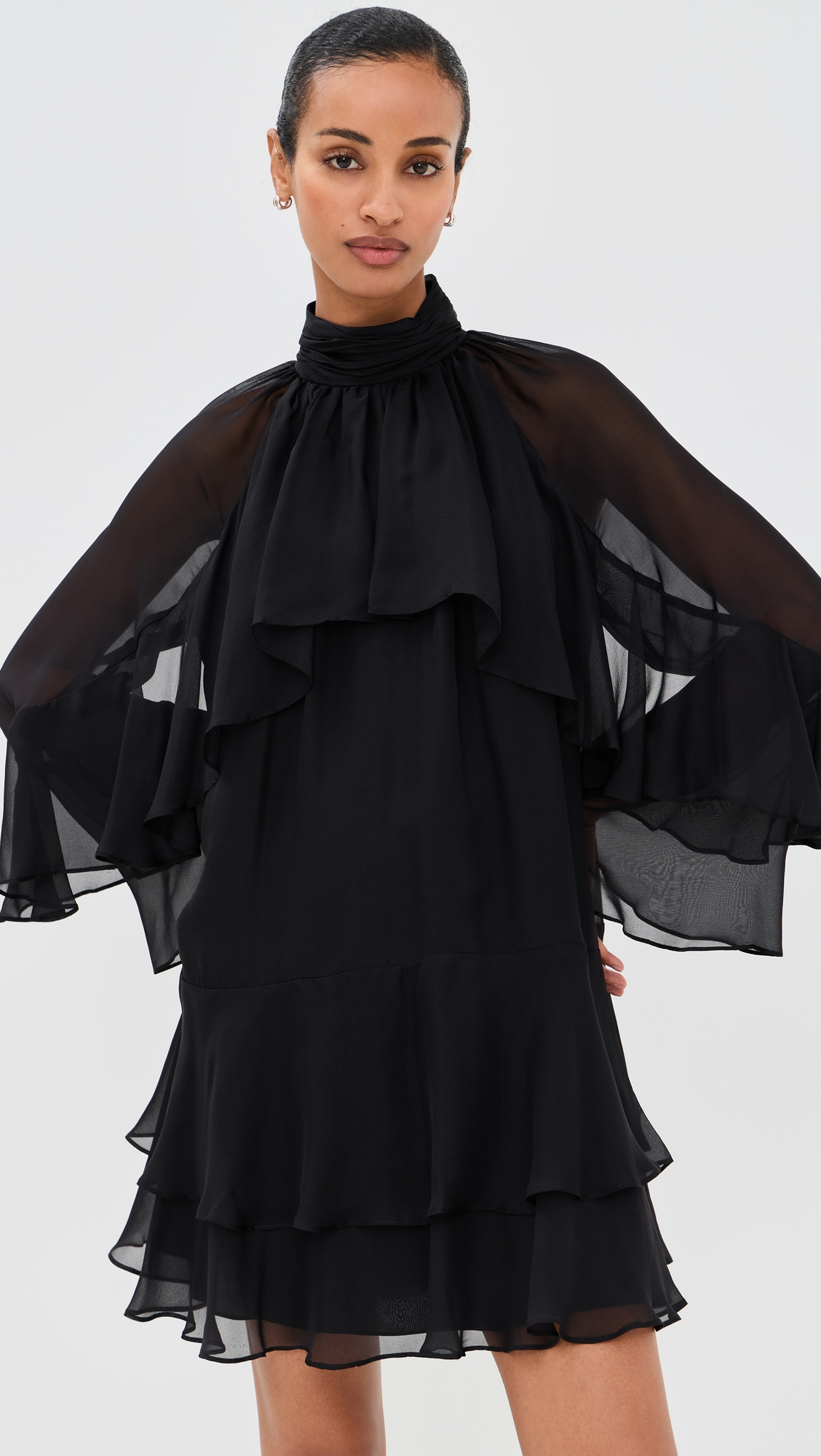 - Fabric: Lightweight, non-stretch chiffon - Cascading tiered ruffles - Mini length - Mock neck - Long sleeves - Buttons at back - Shell: 100% silk - Lined - Lining: 100% polyester - Dry clean - Imported, China Style #VBEAR32987 Size & Fit Model measurements: Size 0: Mical (5'10") usually wears size 0 Measurements from size 0 Length: 33.5in / 85.0cm, from shoulder