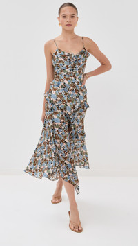 - Fabric: Lightweight, low-stretch silk chiffon - Ruffle trim and handkerchief hem - Floral print and jacquard stripe pattern - Thigh-high slit - Cut on the bias for slight stretch - Midi length - V neck - Adjustable shoulder straps - Hook-and-eye and hidden zip at side - Shell: 100% silk - Partially lined - Lining: 100% polyester - Dry clean - Imported, China Style #VBEAR32888 Size & Fit Designed with a body-skimming, midi-length silhouette. Silk fabric has a smooth feel. Shopbop’s expert stylist says: Runs true to size Model measurements: Size 0: Margaret (5'11") usually wears size 0 Measurements from size 0 Length: 52in / 132.0cm, from shoulder