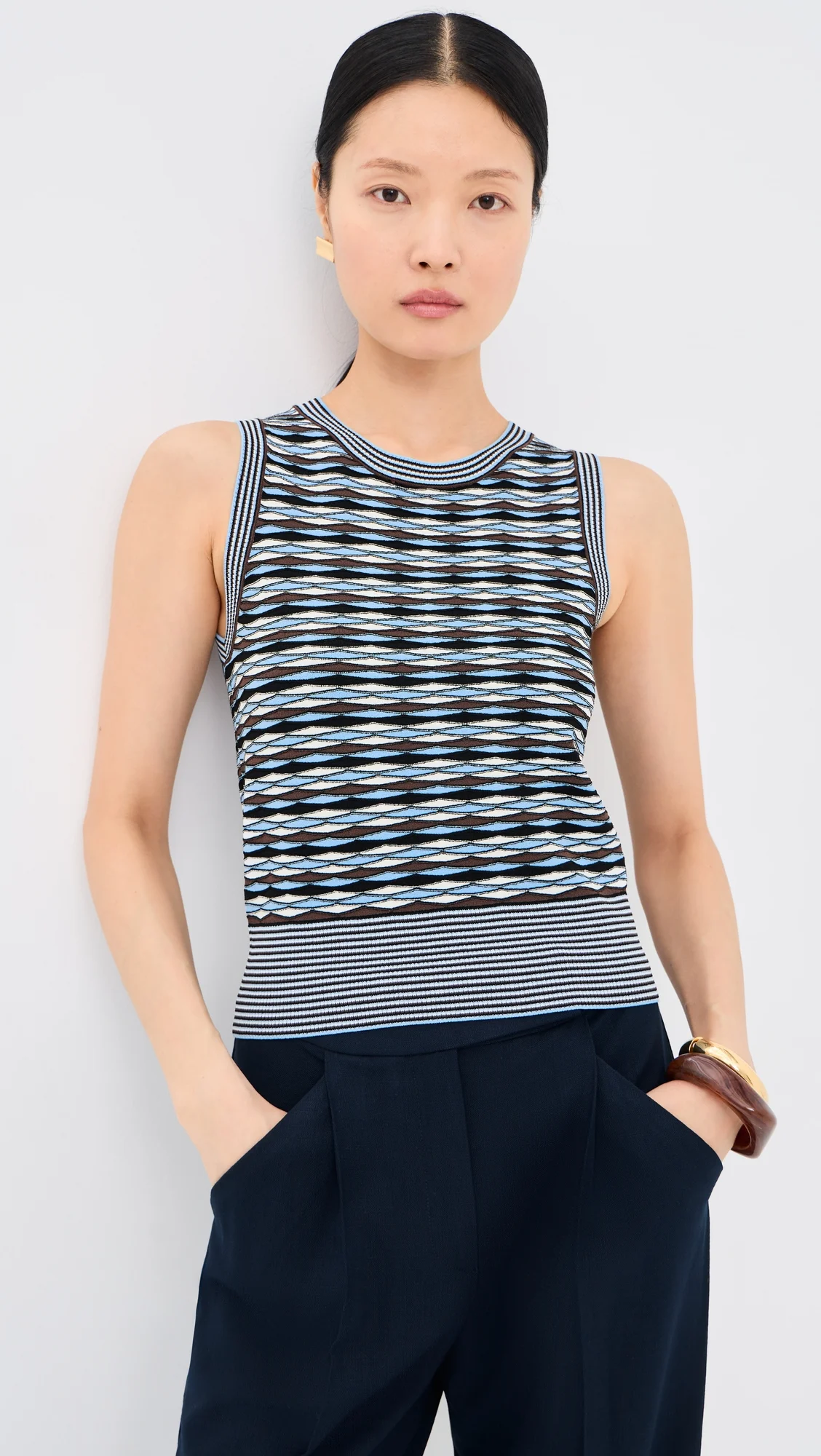 - Fabric: Lightweight stretch knit - Diamond pattern - Stripe trim - Crew neck - Sleeveless - Shell: 83% viscose/17% polyester - Dry clean - Imported, China Style #VBEAR33206 Size & Fit Model measurements: Size S: Somin (5'10.5") usually wears size XS-S Measurements from size S Length: 19.75in / 50.0cm, from shoulder