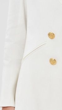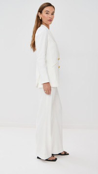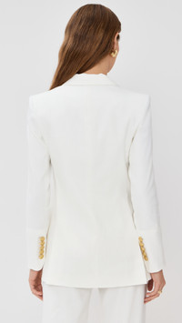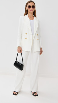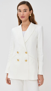 - Fabric: Mid-weight linen weave with stretch - Peak lapels - Padded shoulders - Collared neck - Long sleeves with button cuffs - Double-breasted button placket - Welt front pockets - Shell: 53% linen/29% polyester/16% viscose/2% elastane - Lined - Lining: 95% polyester/5% elastane - Dry clean - Made in the USA of imported materials Style #VBEAR33053