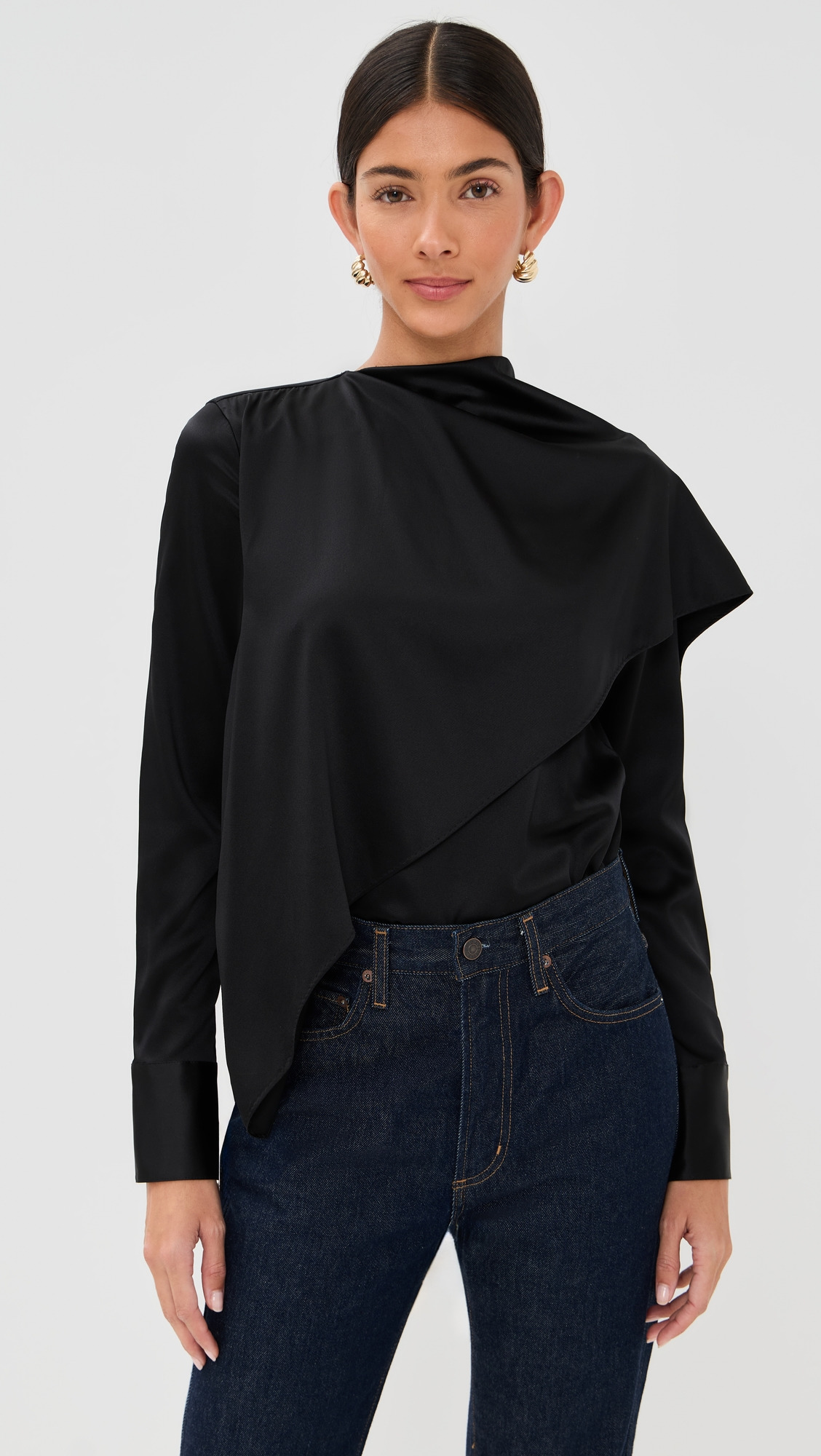 - Fabric: Lightweight, low-stretch fabric - Draped detail - Scarf detail at neckline with fringe trim - Mock neck - Long sleeves with button cuffs - Button keyhole at back - Shell: 53% silk/35% viscose/12% elastane - Dry clean - Imported, China Style #VBEAR32994