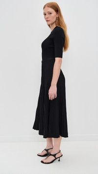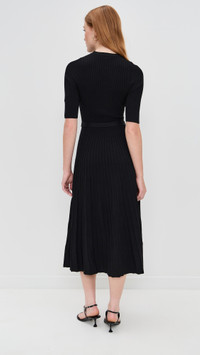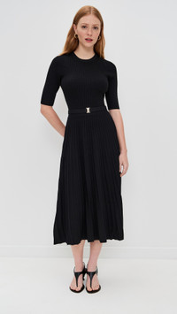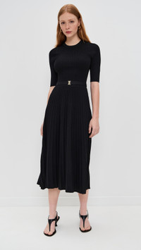 - Fabric: Lightweight, super-stretch ribbed knit - Knit self-belt with gold-tone buckle at waist - Midi length - Crew neck - Elbow-length sleeves - Pullover design, no closure - Shell: 60% viscose/22% nylon/14% polyester/4% elastane - Unlined - Dry clean - Imported, China Style #VBEAR32952