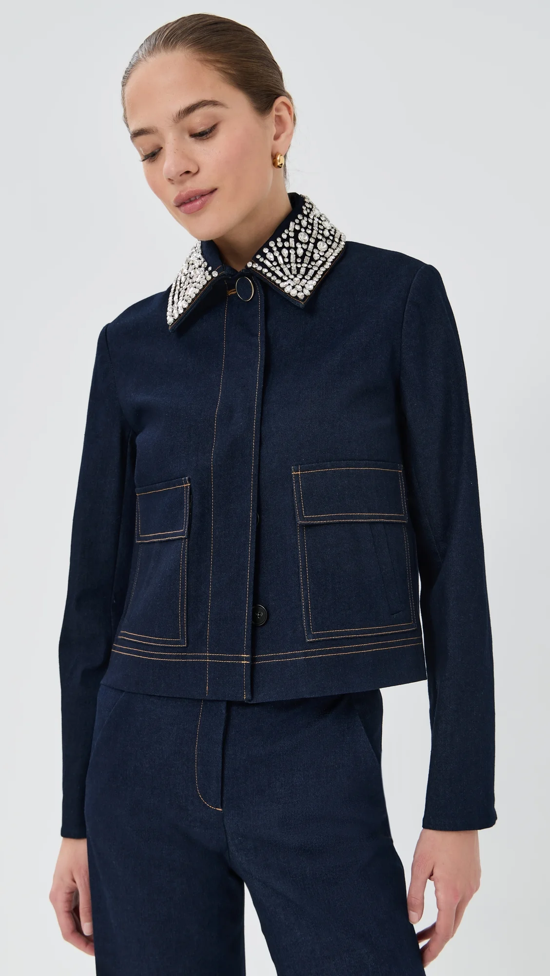 - Fabric: Mid-weight stretch denim - Flap and welt front pockets - Optional crystal embellished lining at neckline - Collared neck - Long sleeves with button cuffs - Covered button placket - Shell: 75% cotton/23% polyester/2% elastane - Lined - Lining: 100% cupro - Dry clean - Imported, China Style #VBEAR33098