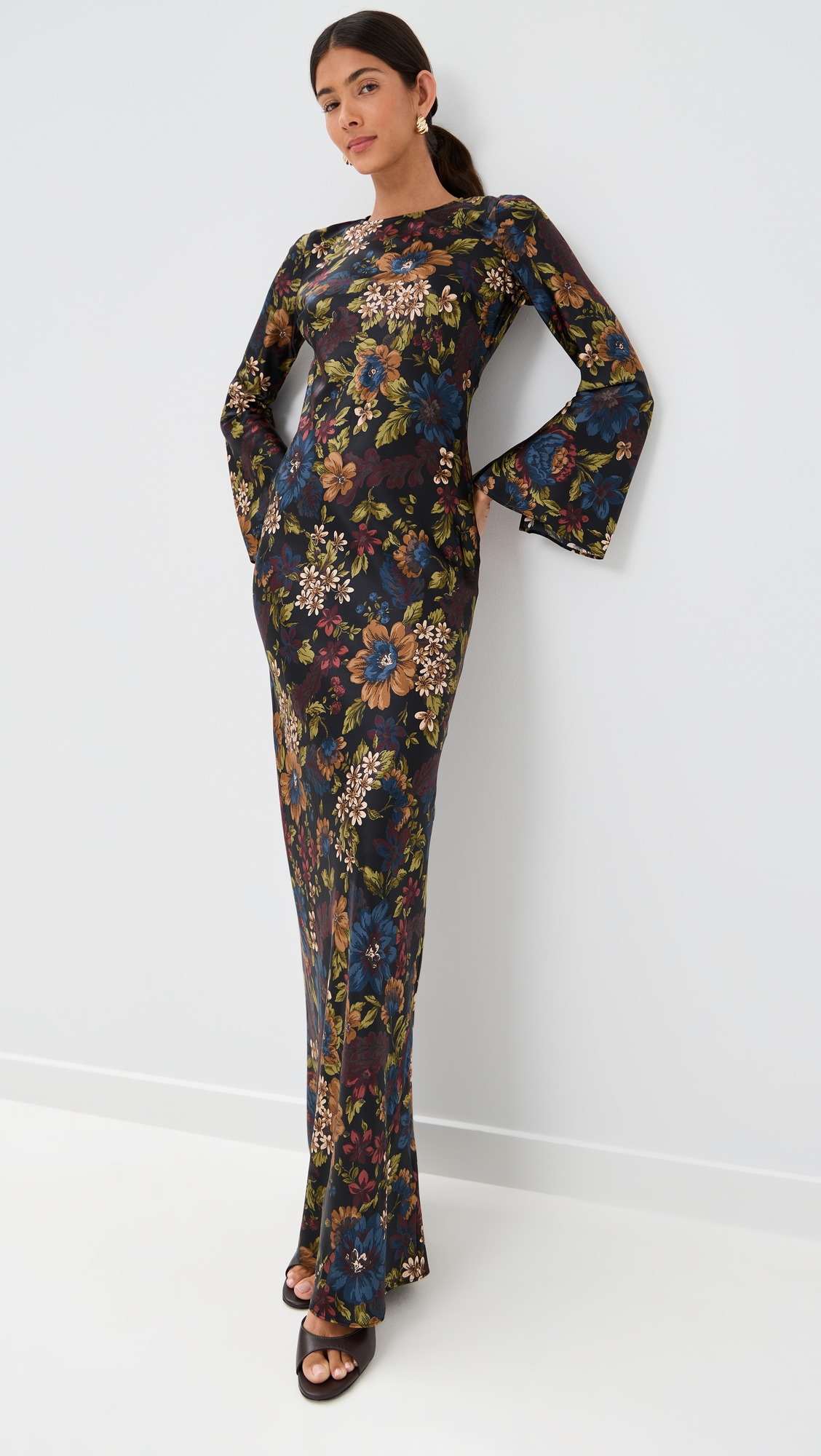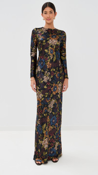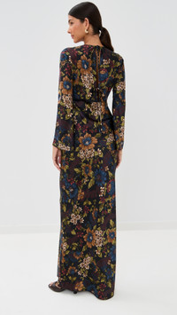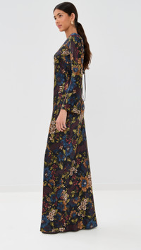 - Fabric: Lightweight stretch satin - Floral print - Maxi length - Crew neck - Long bell sleeves - Hook-and-eye and ties at back - Shell: 53% silk/35% viscose/12% elastane - Unlined - Dry clean - Imported, China Style #VBEAR33043 Size & Fit Model measurements: Size 0: Brittany (5'9.5") usually wears size 0 Measurements from size 2 Length: 63.5in / 161.0cm, from shoulder