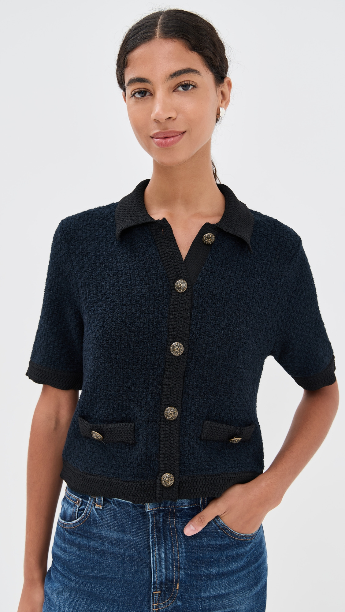 - Fabric: Mid-weight boucle knit with stretch - Contrast ribbed trim - Faux welt front pockets - Collared neck - Short sleeves - Button placket - Shell: 58% cotton/23% wool/19% nylon - Dry clean - Imported, China Style #VBEAR32963