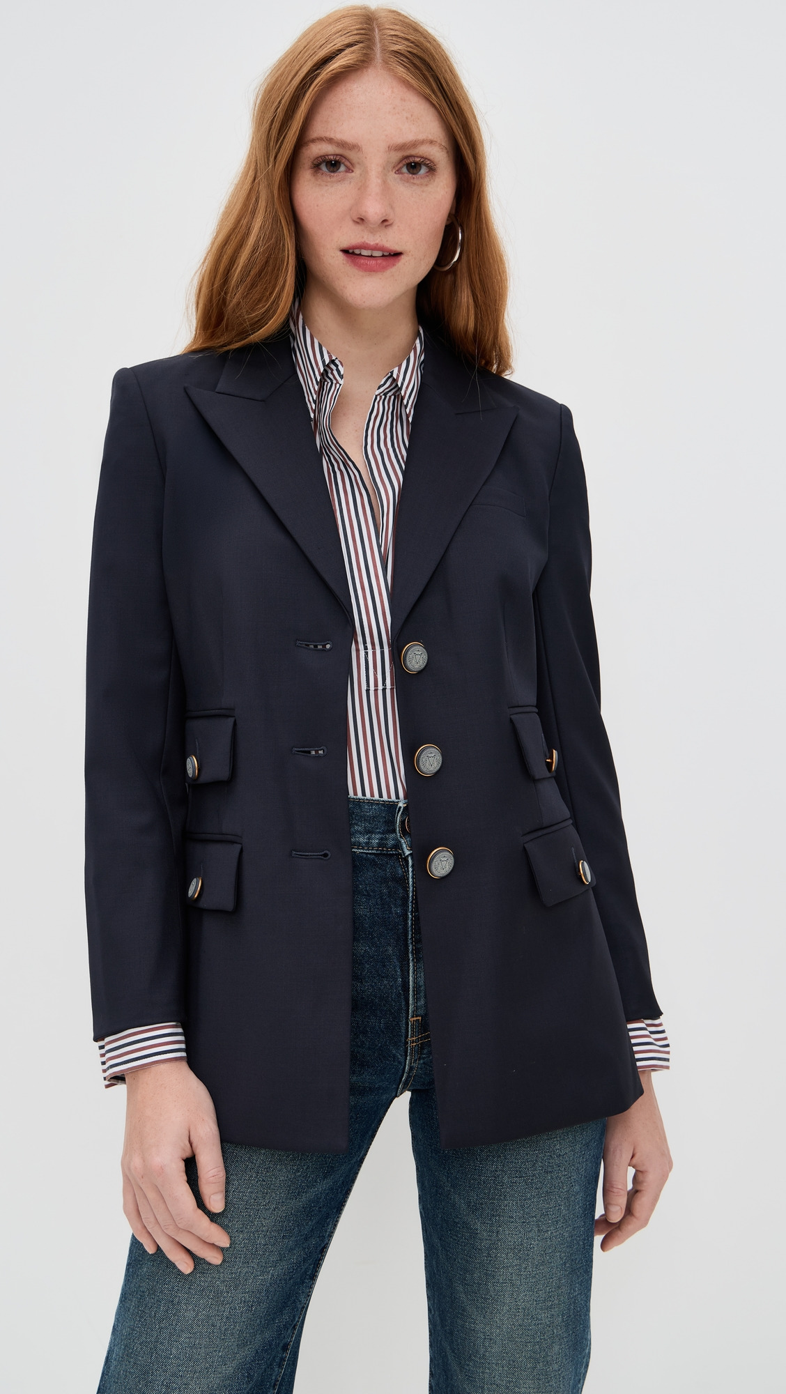 - Fabric: Mid-weight stretch suiting - Padded shoulders - Collared neck - Long sleeves with button cuffs - Button placket - Flap front pockets - Shell: 59% virgin wool/39% polyester/2% elastane - Lined - Lining: 100% viscose - Dry clean - Imported, Vietnam Style #VBEAR32960