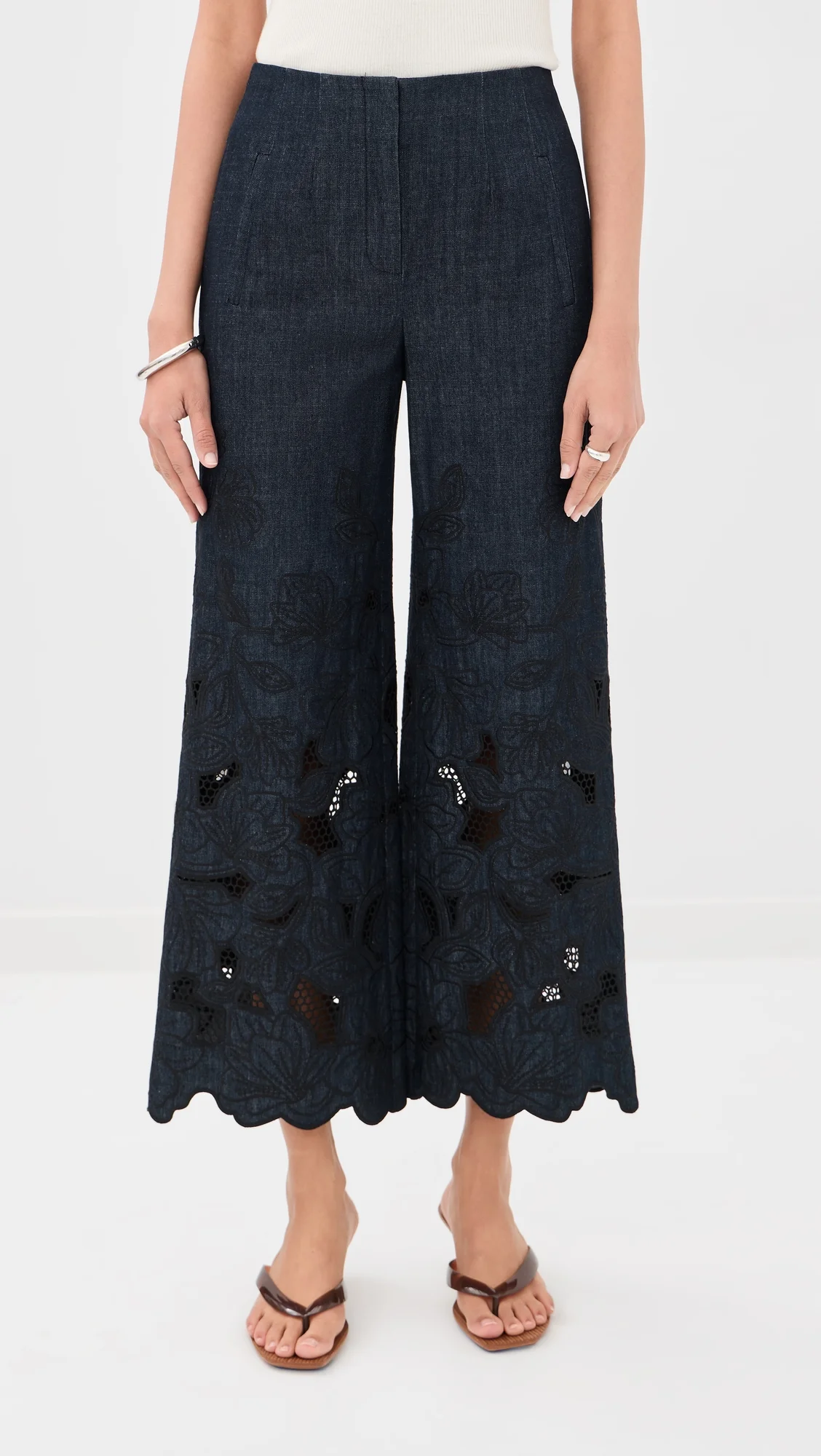 - Fabric: Mid-weight, non-stretch denim - Mesh cutouts - Scalloped hem - Embroidered flowers - Hook-and-eye closures at waist, zip fly - Welt front and back pockets - Shell: 100% cotton - Dry clean - Imported, China Style #VBEAR33212 Size & Fit Model measurements: Size 0: Priyanka (5'9") usually wears size 0 Measurements from size 0 Rise: 10.25in / 26cm Inseam: 27.5in / 70cm Leg opening: 22.75in / 58cm