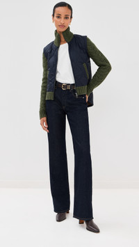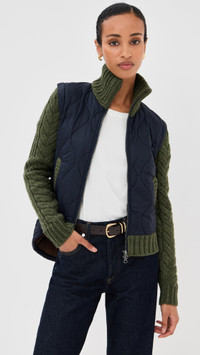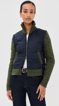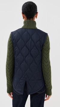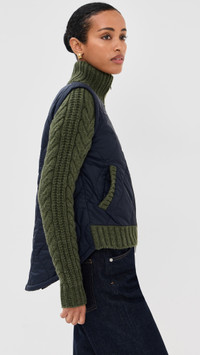 - Fabric: Mid-weight cable knit with stretch - Quilted technical weave vest - High-low hem with single back vent - Mock neck - Long sleeves - Two-way zip closure - Slant hip pockets - Shell: 80% wool/20% nylon - Trim: 100% nylon - Lined - Fill: 100% polyester - Dry clean - Imported, China Style #VBEAR33130 Size & Fit Model measurements: Size XS: Mical (5'10") usually wears size XS Measurements from size XS Length: 19.75in / 50.0cm, from shoulder to front hem Length: 24in / 61.0cm, from shoulder to back hem