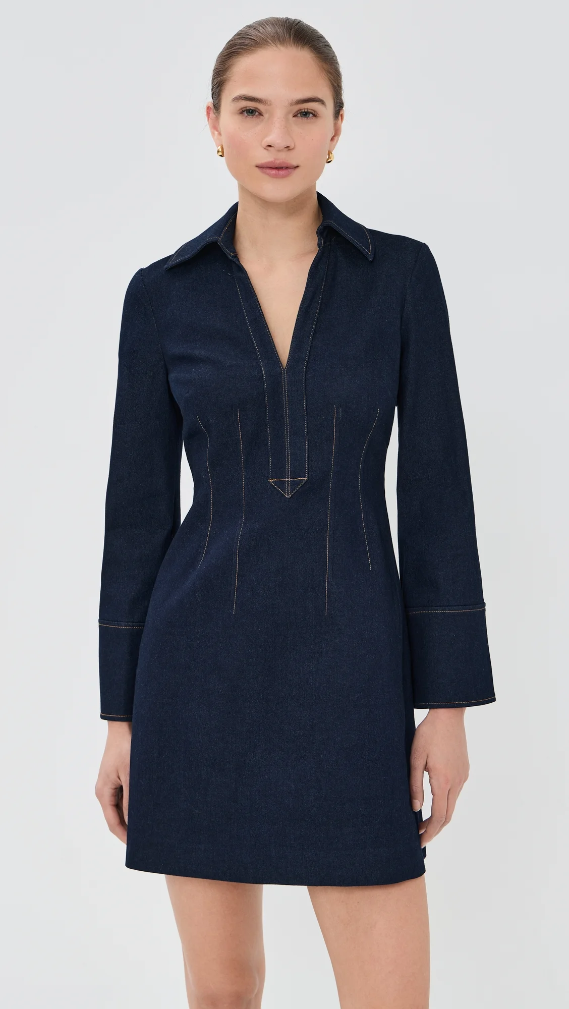 - Fabric: Mid-weight stretch denim - Mini length - Collared neck - Long sleeves with button cuffs - Hidden zip at side - Shell: 75% cotton/23% polyester/2% elastane - Unlined - Dry clean - Imported, China Style #VBEAR33106