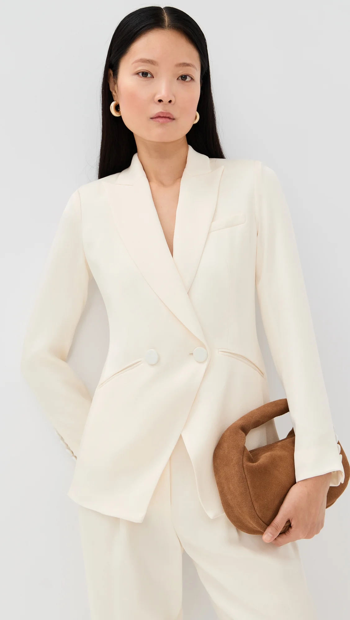 - Fabric: Mid-weight, non-stretch sateen crepe - Padded shoulders - Peaked lapels - Collared neck - Long sleeves with button cuffs - Double-breasted button placket - Welt front pockets - Shell: 72% acetate/28% rayon - Lined - Lining: 96% polyester/4% elastane - Dry clean - Made in the USA of imported materials Style #VBEAR32942