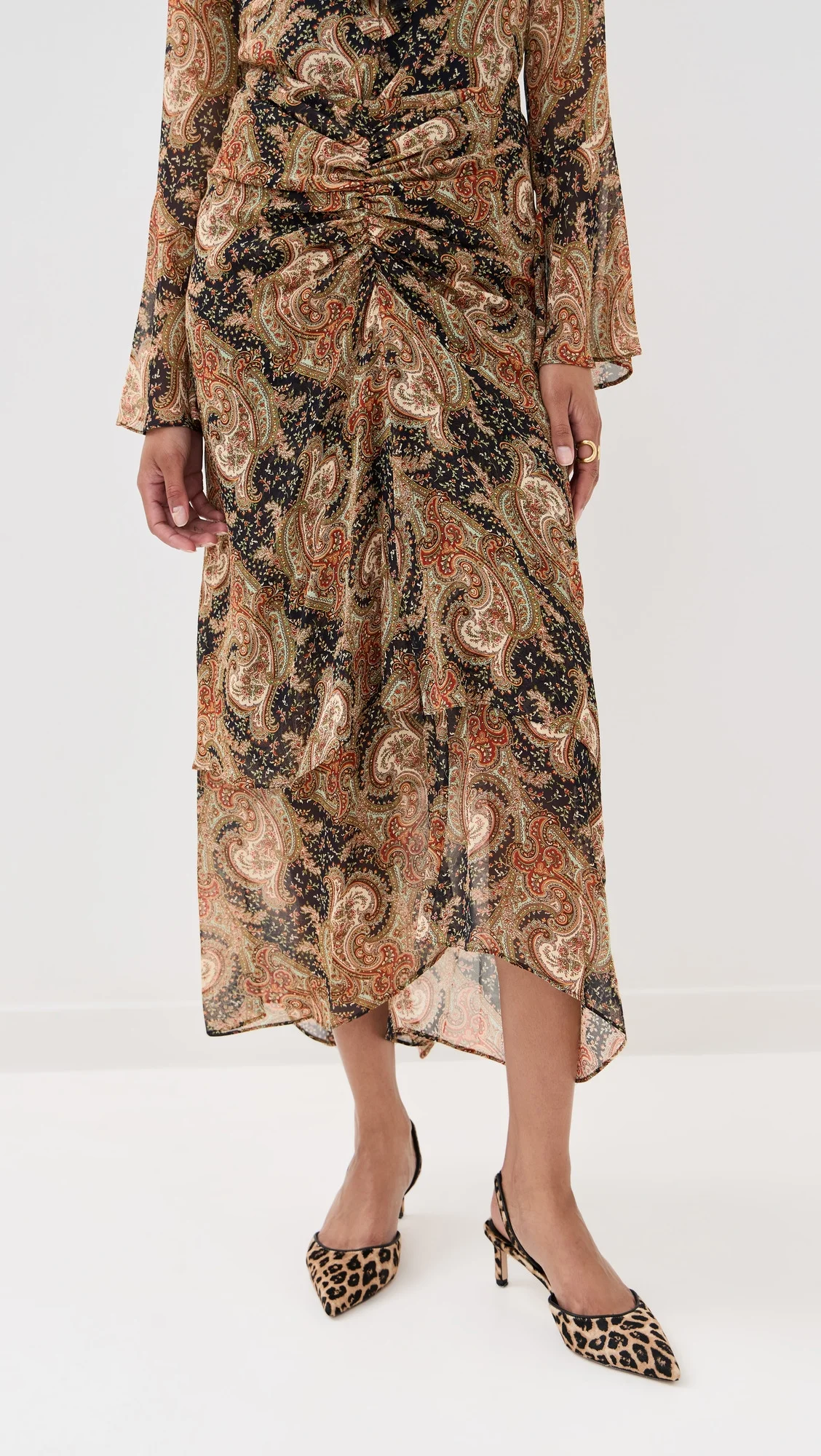 - Fabric: Lightweight, non-stretch chiffon - Ruching at waist - Paisley print - Asymmetrical hem - Hook-and-eye and hidden zip at back - Shell: 100% silk - Lined - Lining: 100% polyester - Dry clean - Imported, China Style #VBEAR32958 Size & Fit Model measurements: - Size 0: Anisa (5'8.5") usually wears size 0 - Size 2: Samruddhi (5'8") usually wears size 0-2 Measurements from size 0 Length: 36.25in / 92.0cm