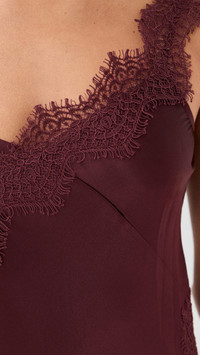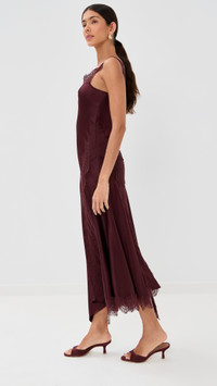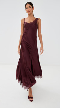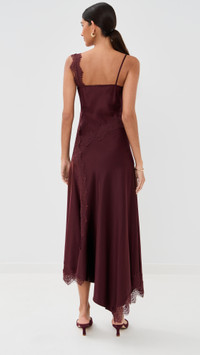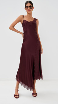 - Fabric: Lightweight, low-stretch satin - Lace trim - Asymmetrical hem - Midi length - V neck - Sleeveless - Pullover design, no closure - Shell: 53% silk/35% viscose/12% elastane - Unlined - Dry clean - Imported, China Style #VBEAR32979 Size & Fit Customers say: Runs large; please size down. Model measurements: Size 2: Brittany (5'9.5") usually wears size 0 Measurements from size 2 Length: 50.75in / 129.0cm, from shoulder