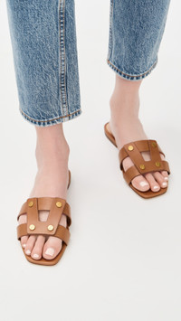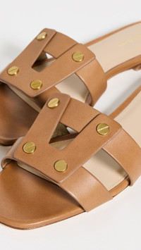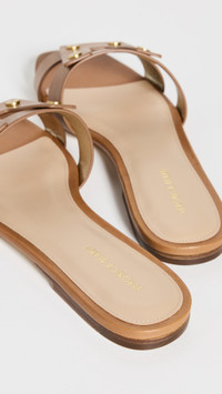 - Upper: Leather - Strappy design - Gold-tone hardware - Lining: Leather - Slip on - Open toe - Leather sole with rubber heel cap - Imported, China - This item cannot be gift-boxed Style #VBEAR32703