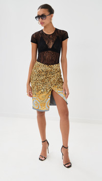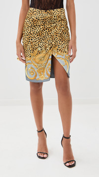 - Fabric: Heavyweight slinky jersey with stretch - Draped detailing and front slit - Cheetah print - Hook-and-eye and hidden zip at side - Shell: 100% viscose - Lined - Dry clean - Made in Italy Style #VERSA31344 Size & Fit Model measurements: Size 36: Drew (5'8") usually wears size 36-38 Measurements from size 38 Length: 22.75in / 58.0cm
