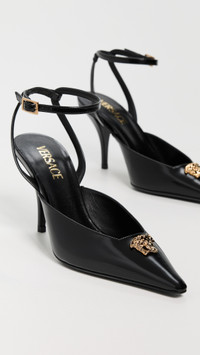 - Upper: Leather - Gold-tone logo emblem detail - Lining: Leather - Covered heel - Buckle ankle strap - Pointed toe - Leather sole with rubber heel cap - Made in Italy - This item cannot be gift-boxed Style #VERSA31330 Size & Fit Heel: 3.25in / 85mm