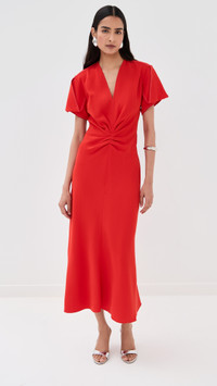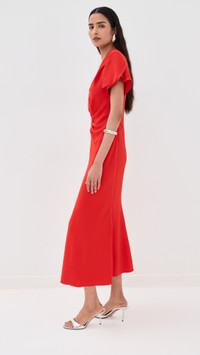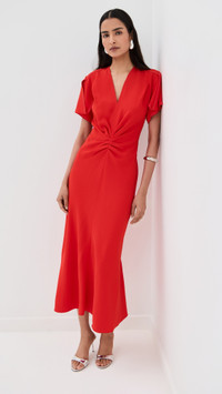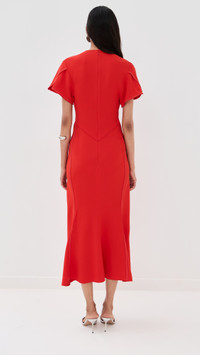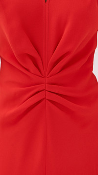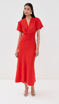 - Fabric: Mid-weight stretch crepe - Ruching at waist - Midi length - V neck - Short sleeves - Hook-and-eye and hidden zip at back - Shell: 50% viscose/47% acetate/3% elastane - Unlined - Dry clean - Made in Portugal Style #VBEDB30553