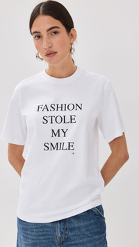 - Fabric: Lightweight jersey - 'Fashion Stole My Smile' lettering - Crew neck - Short sleeves - Shell: 100% cotton - Wash cold - Made in Portugal Style #VBEDB30459 Size & Fit Measurements from size XS Length: 26in / 66.0cm, from shoulder