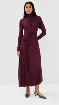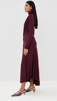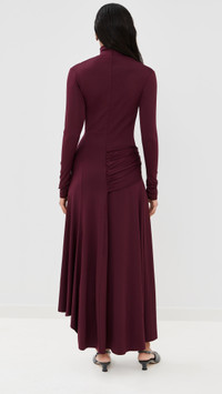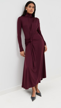 - Fabric: Lightweight, super-stretch fine jersey - Draped sash and knotted detail at waist - Asymmetrical hem - Maxi length - Mock neck - Long sleeves - Hidden zip at back - Shell: 90% polyester/10% elastane - Unlined - Dry clean - Made in Portugal Style #VBEDB30575 Size & Fit Model measurements: Size 4: Samruddhi (5'8") usually wears size 4-6 Measurements from size 2 Length: 52in / 132.0cm, from shoulder to front hem