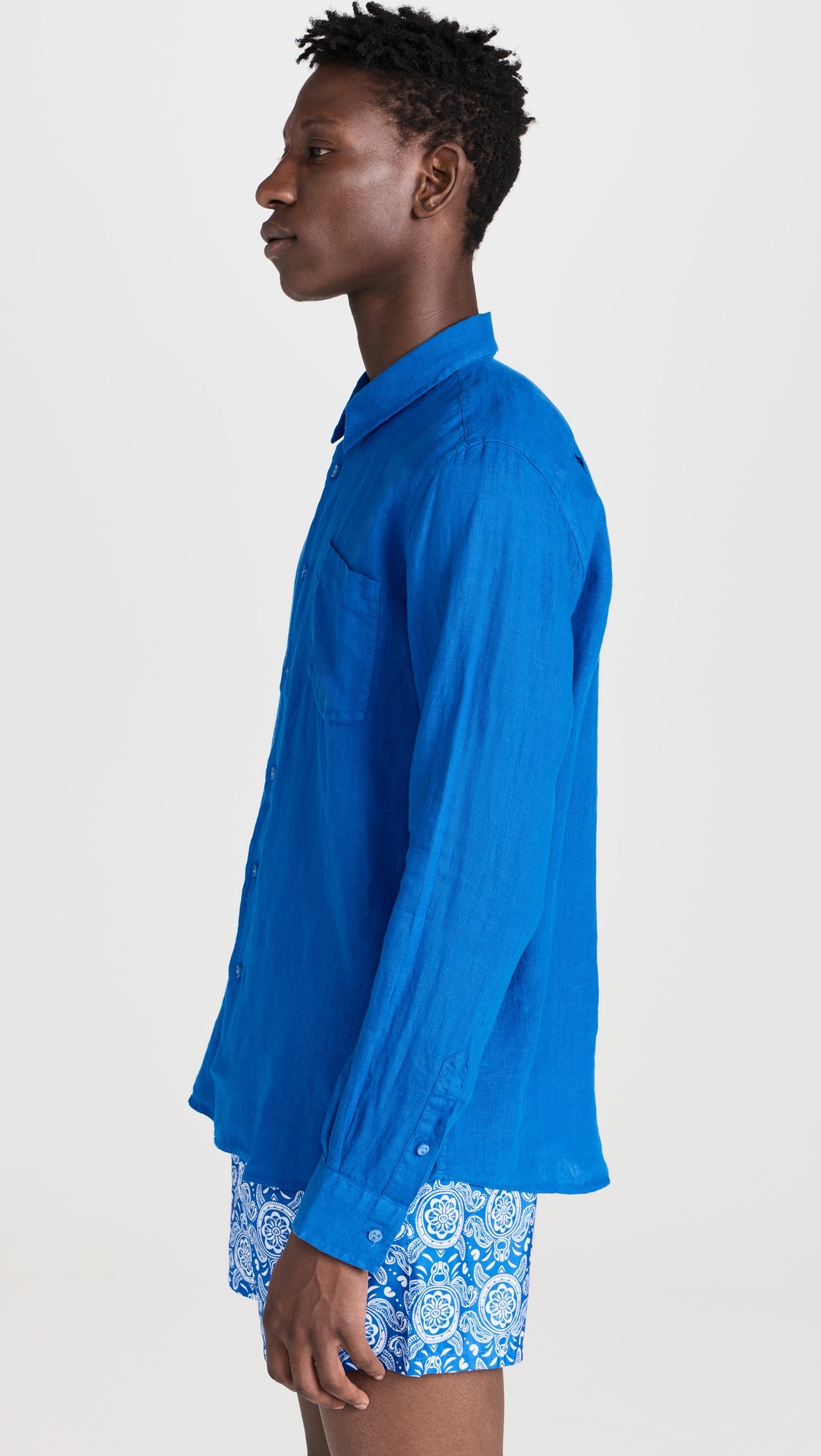 - Fabric: Lightweight, non-stretch linen weave - Curved hem - Collared neckline - Long sleeves with button cuffs - Button placket - Patch breast pocket - Shell: 100% linen - Wash cold - Imported, Morocco Style #VILEB30186