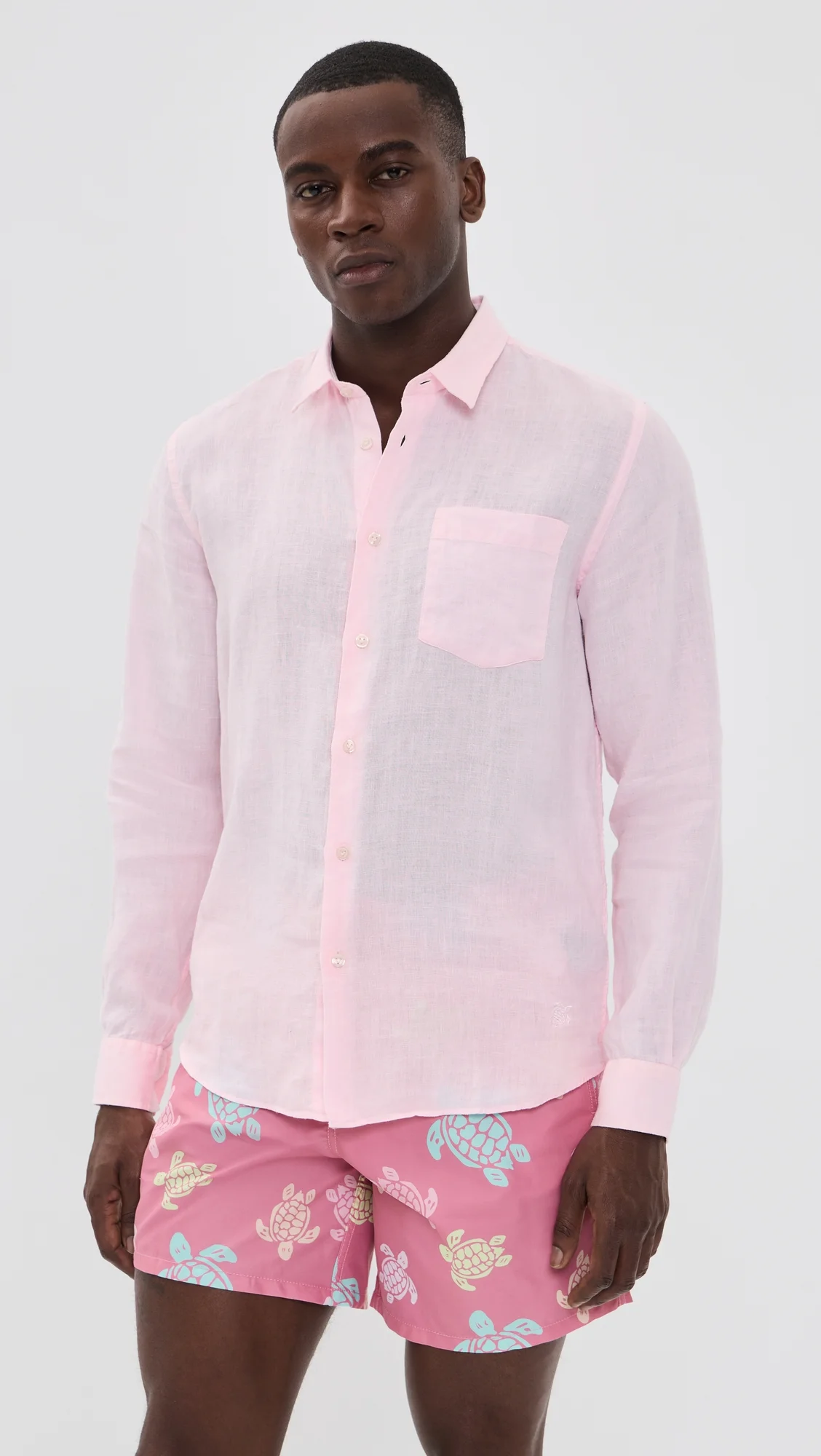 - Fabric: Lightweight, non-stretch linen weave - Embroidered turtle at hem - Collared neckline - Long sleeves with button cuffs - Button placket - Patch breast pocket - Shell: 100% linen - Wash cold - Imported, Morocco Style #VILEB30226