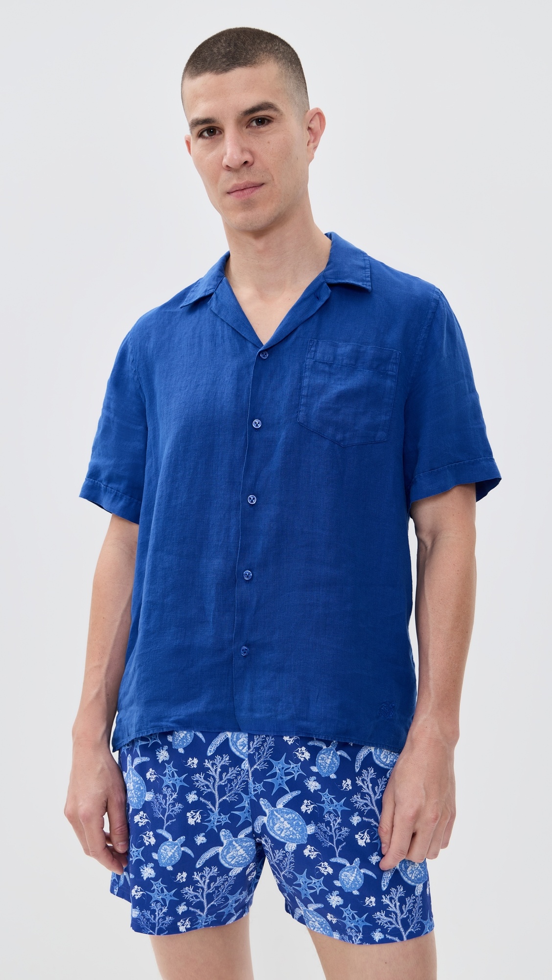 - Fabric: Lightweight, non-stretch linen weave - Camp collar - Short sleeves - Button placket - Patch breast pocket - Shell: 100% linen - Wash cold - Imported, Morocco Style #VILEB30197