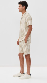 - Fabric: Mid-weight, low-stretch knit - Textural stripe pattern - Camp collar - Short sleeves - Button placket - Shell: 75% cotton/25% polyester - Wash cold - Imported, Peru Style #VINCE52909