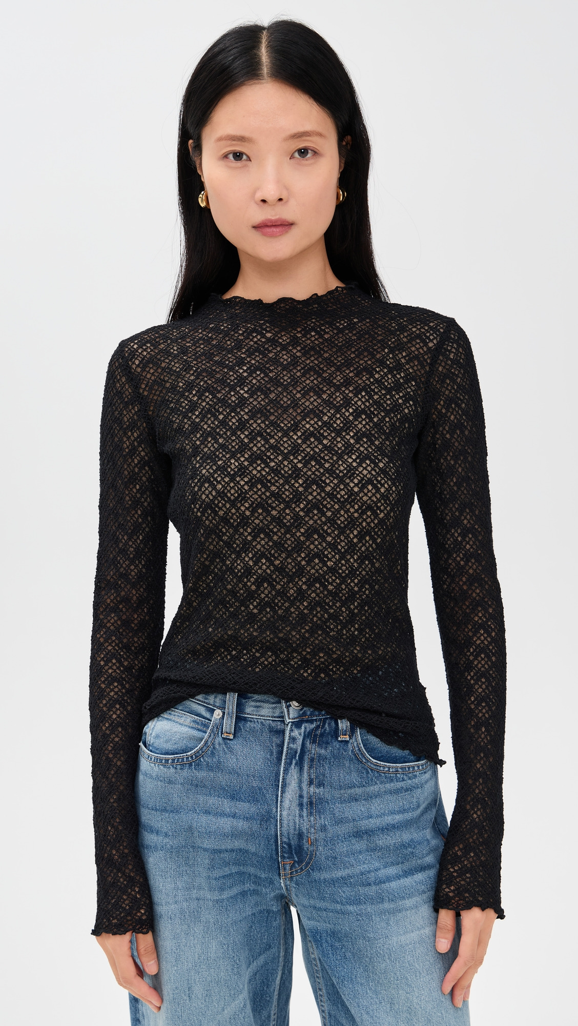 - Fabric: Lightweight stretch lace - Lettuce trim - Mock neck - Long sleeves - Shell: 61% cotton/38% nylon/1% spandex - Optional slip lining - Lining: 95% lyocell/5% spandex - Hand wash - Imported, Thailand Style #VINCE53072 Size & Fit Model measurements: Size S: Somin (5'10.5") usually wears size XS-S Measurements from size S Length: 21.75in / 55.0cm, from shoulder