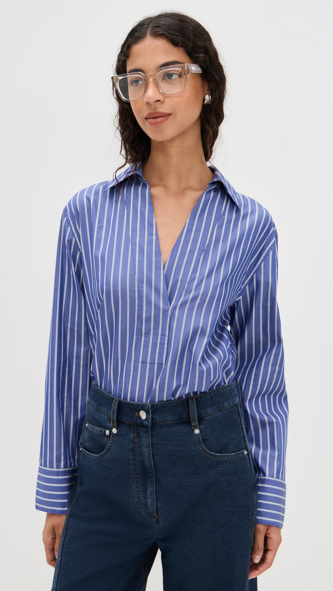 - Fabric: Lightweight, non-stretch weave - Striped pattern - Collared V neck - Long sleeves with button cuffs - Shell: 100% cotton - Wash cold - Imported, Vietnam Style #VINCE52944