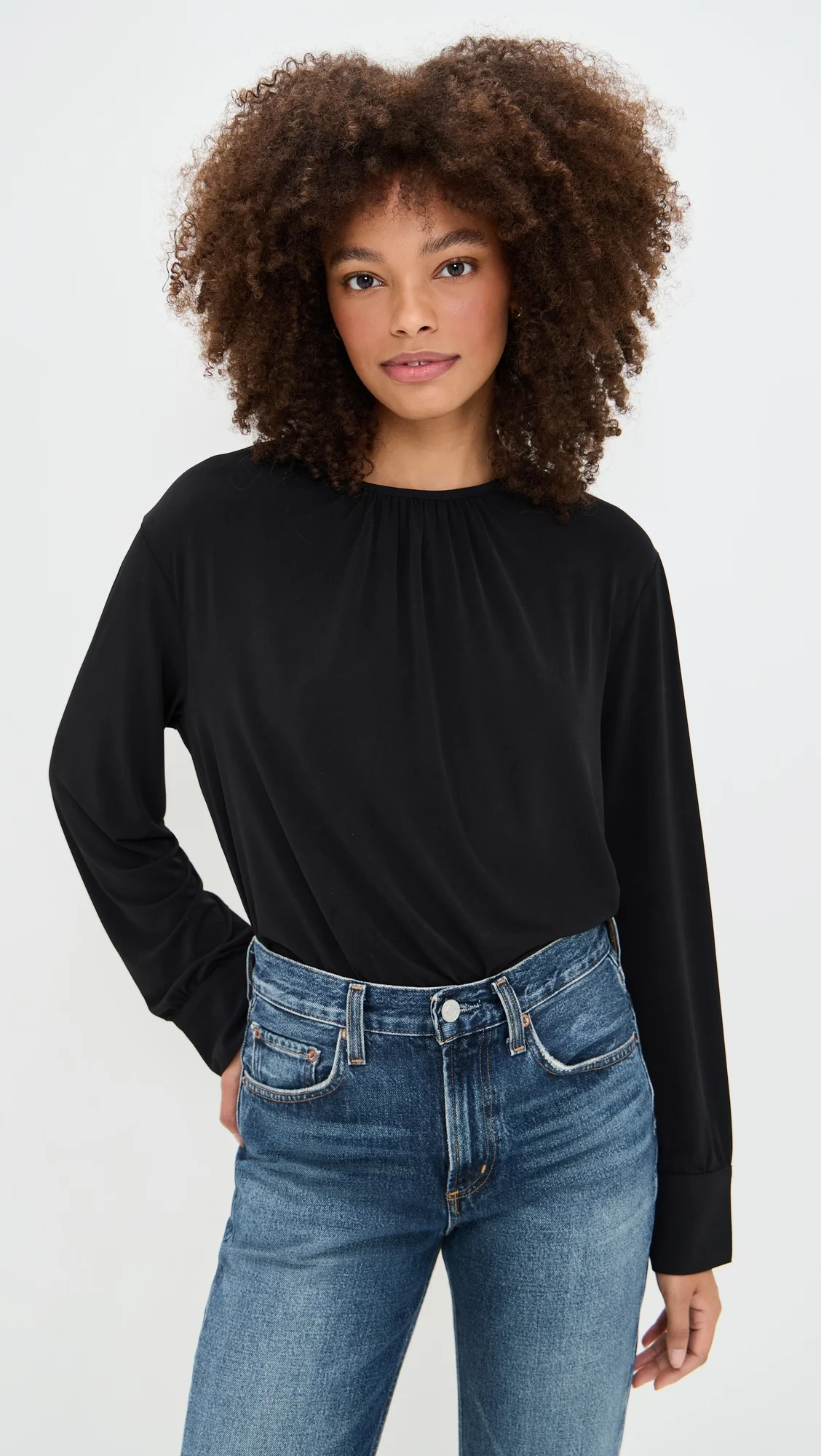 - Fabric: Lightweight, super-stretch jersey - Gathered neck and cuffs - Crew neck - Long sleeves with button cuffs - Button keyhole at back - Shell: 95% polyester/5% spandex - Wash cold - Imported, Vietnam Style #VINCE53051 Size & Fit Model measurements: Size S: Alexis (5'8") usually wears size XS-S Measurements from size S Length: 23.5in / 60.0cm, from shoulder