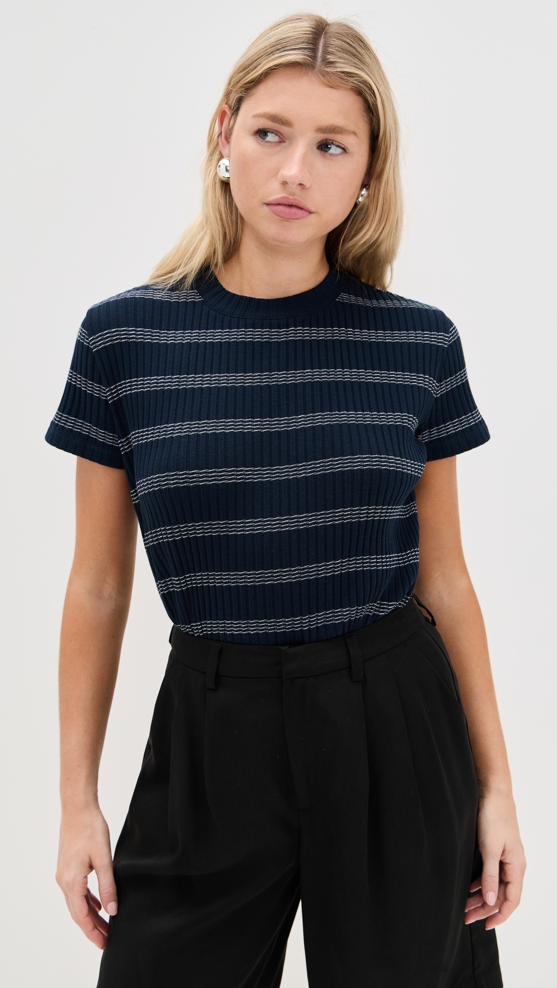 - Fabric: Lightweight, super-stretch ribbed knit - Striped pattern - Crew neck - Short sleeves - Shell: 94% cotton/6% spandex - Hand wash or dry clean - Imported, China Style #VINCE52940