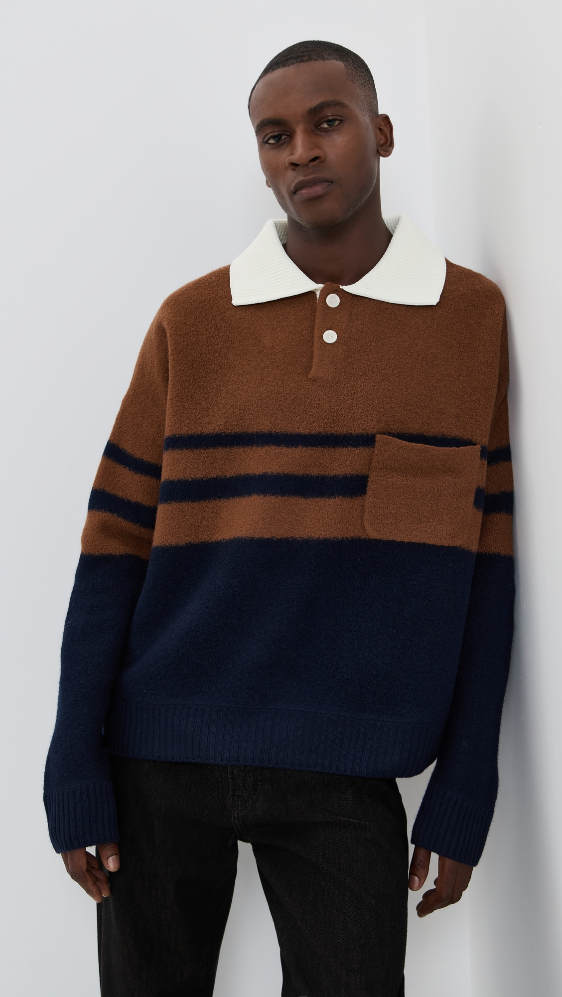 - Fabric: Mid-weight, low-stretch knit - Stripe pattern and ribbed edges - Logo embroidery at hem - Polo neckline - Long sleeves - Partial button placket - Patch breast pocket - Shell: 100% wool - Hand wash - Imported, China Style #WBONN30065 Size & Fit Model measurements: Size M: Idriss (6'1") usually wears size M-L Measurements from size M Length: 25.25in / 64cm Sleeve: 34.75in / 88cm Chest: 53.5in / 136cm