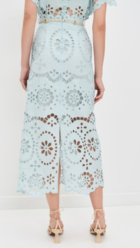 - Fabric: Lightweight, non-stretch linen - Allover eyelet embroidery - Removable beaded crochet belt - Scalloped edges - Slit at back hem - Hook-and-eye and hidden zip at back - Shell: 100% linen - Trim: 100% polyester - Partially lined - Lining: 100% cotton - Dry clean - Imported, China Style #ZIMME43417 Size & Fit Model measurements: Size 0: Mily (5'11") usually wears size 0 Measurements from size 0 Length: 37.75in / 96.0cm