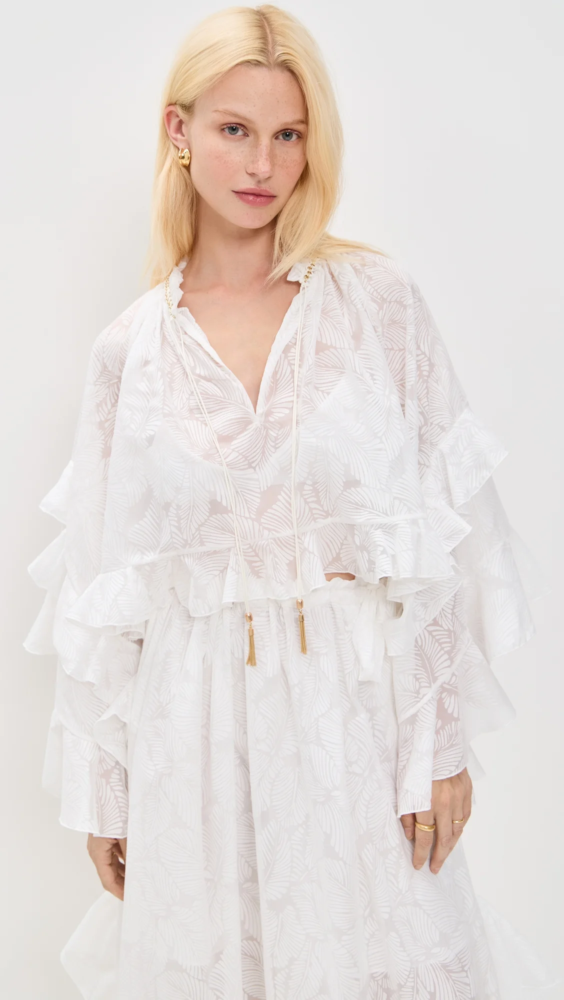 - Fabric: Lightweight, non-stretch voile - Ruffles at sleeves and hem - Gold-tone hardware at neck - Split neckline - Long bell sleeves - Shell: 58% cotton/42% polyester - Partially lined - Lining: 100% cotton - Hand wash - Imported, China Style #ZIMME43431 Size & Fit Model measurements: Size 0: Annalise (5'8") usually wears size 0 Measurements from size 0 Length: 18in / 46.0cm