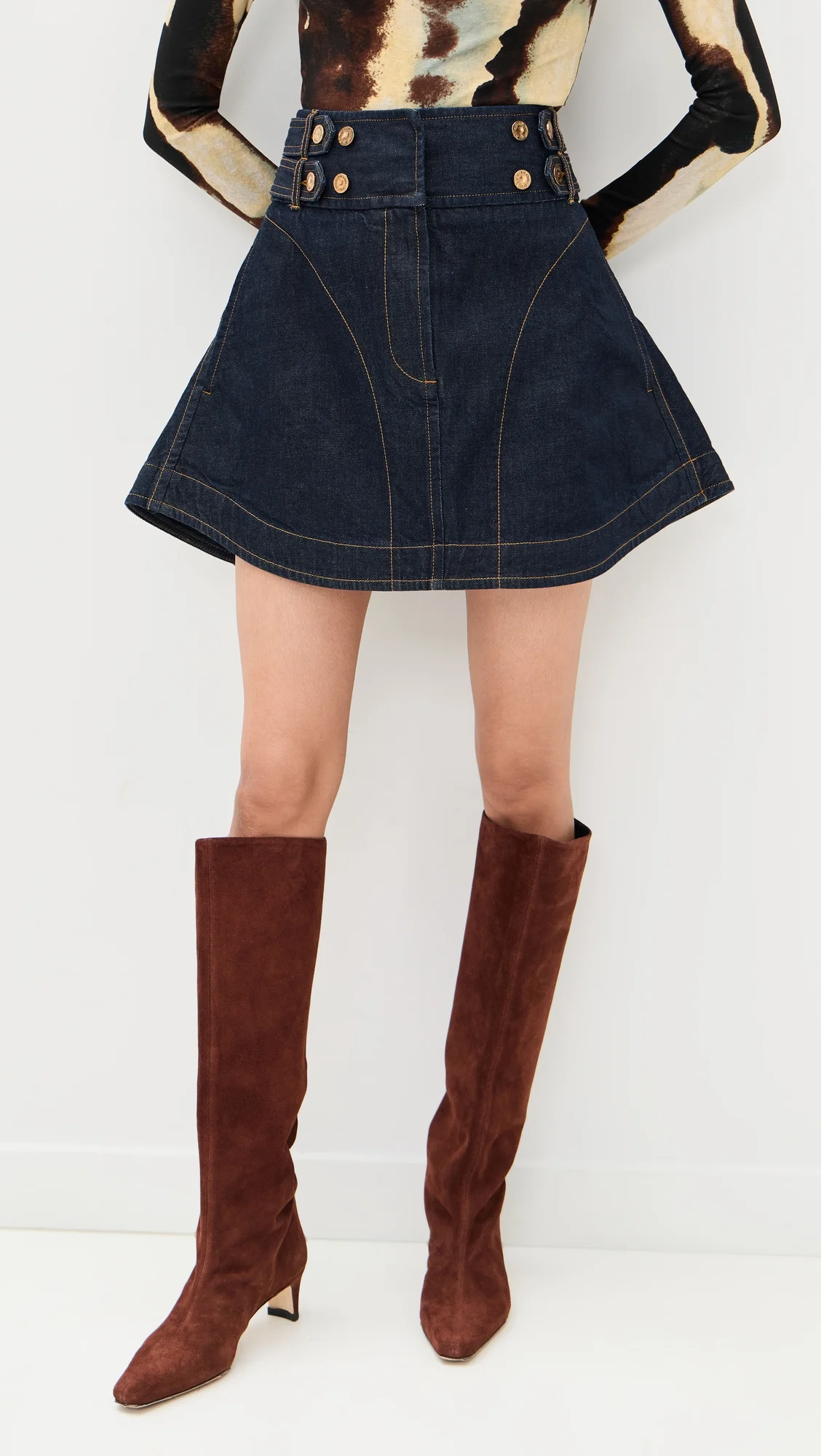 - Fabric: Heavyweight, non-stretch denim - Gathered at back - Adjustable bar tabs with belt loops at waistband - Asymmetrical hem - Hook-and-eye closures at waist, zip fly - On-seam side pockets - Shell: 75% cotton/25% viscose - Wash cold - Imported, China Style #ZIMME43479
