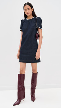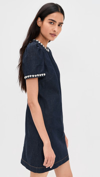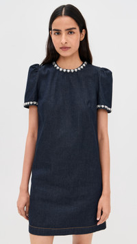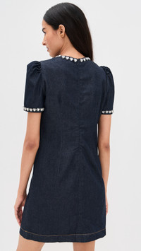 - Fabric: Mid-weight, non-stretch denim - Heart-shaped crystal embellishments at neckline and cuffs - Darted bust - Mini length - Crew neck - Short puff sleeves - Hidden zip at back - Shell: 100% cotton - Trim: 100% polyester - Unlined - Dry clean - Imported, China Style #ZIMME43363