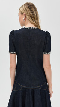 - Fabric: Lightweight, non-stretch denim - Heart crystal embellished trim - Gathered shoulders - Crew neck - Short sleeves - Hidden zip at back - Shell: 100% cotton - Dry clean - Imported, China Style #ZIMME43359