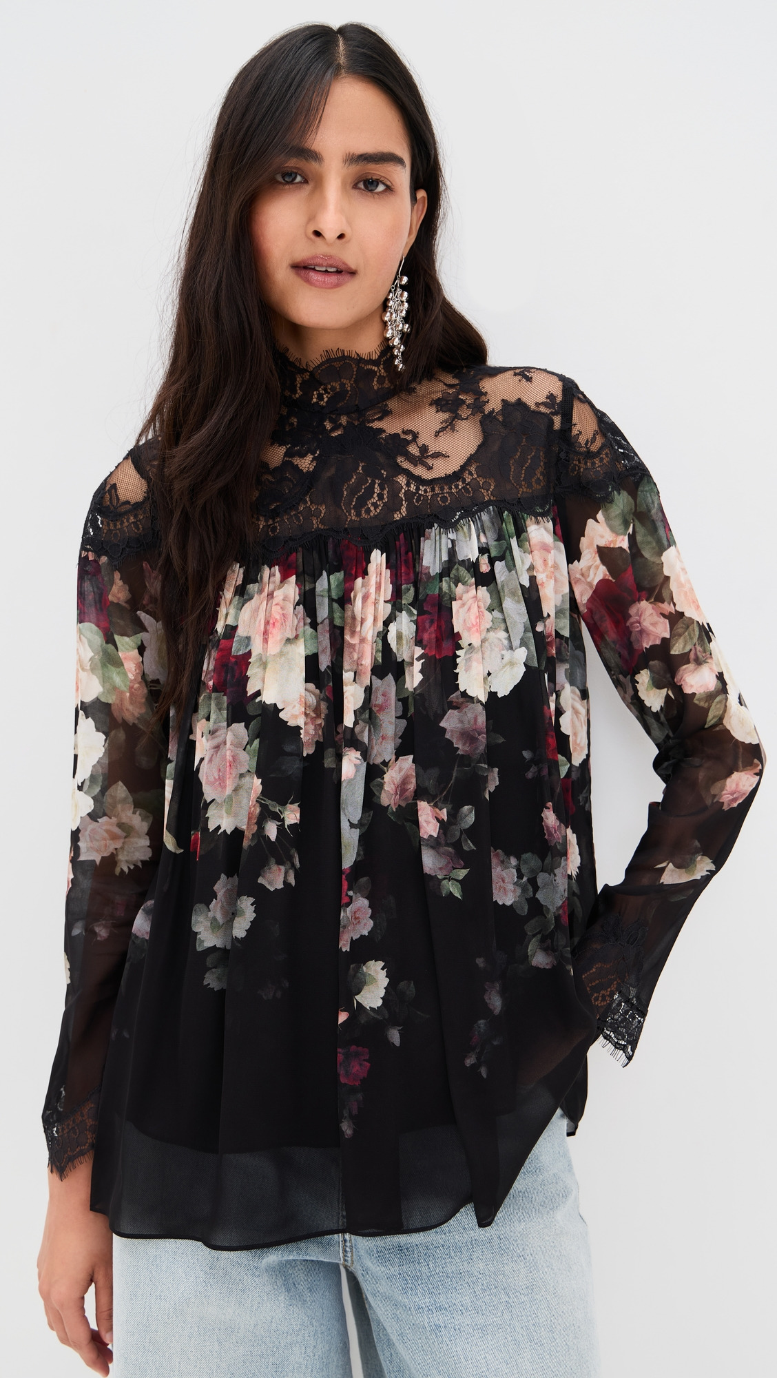 - Fabric: Lightweight, non-stretch chiffon - Floral print - Lace yoke and trim - Mock neck - Long sleeves - Hidden zip at back - Shell: 100% viscose - Trim: 56% cotton/44% polyamide - Partially lined - Lining: 100% viscose - Dry clean - Imported, China Style #ZIMME43374