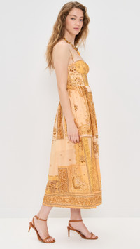 - Fabric: Lightweight, non-stretch weave - Smocked elastic back panel - Padded cups and boned side seams - Bandana print - Midi length - Sweetheart neckline - Hook-and-eye and hidden zip at back - On-seam side pockets - Shell: 100% cotton - Lined - Lining: 100% cotton - Dry clean - Imported, China - Adjustable shoulder straps Style #ZIMME43305