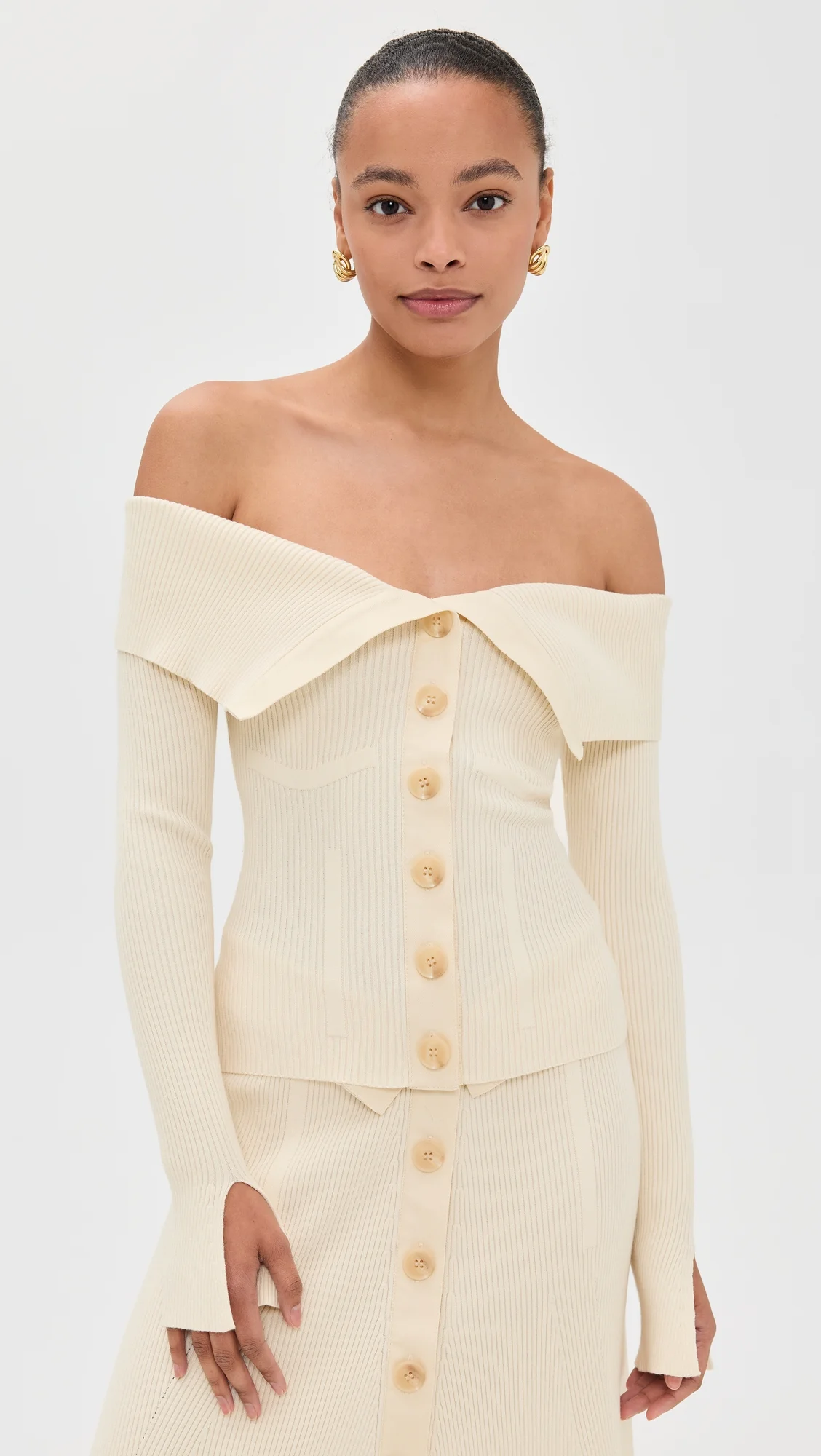 - Fabric: Mid-weight ribbed knit with stretch - Foldover neckline - Off-shoulder neckline - Long sleeves - Button placket - Shell: 71% viscose/29% polyester - Dry clean - Imported, China Style #ZIMME43478 Size & Fit Model measurements: Size 0: Alexis (5'8") usually wears size 0 Measurements from size 0 Length: 15.75in / 40.0cm, from shoulder