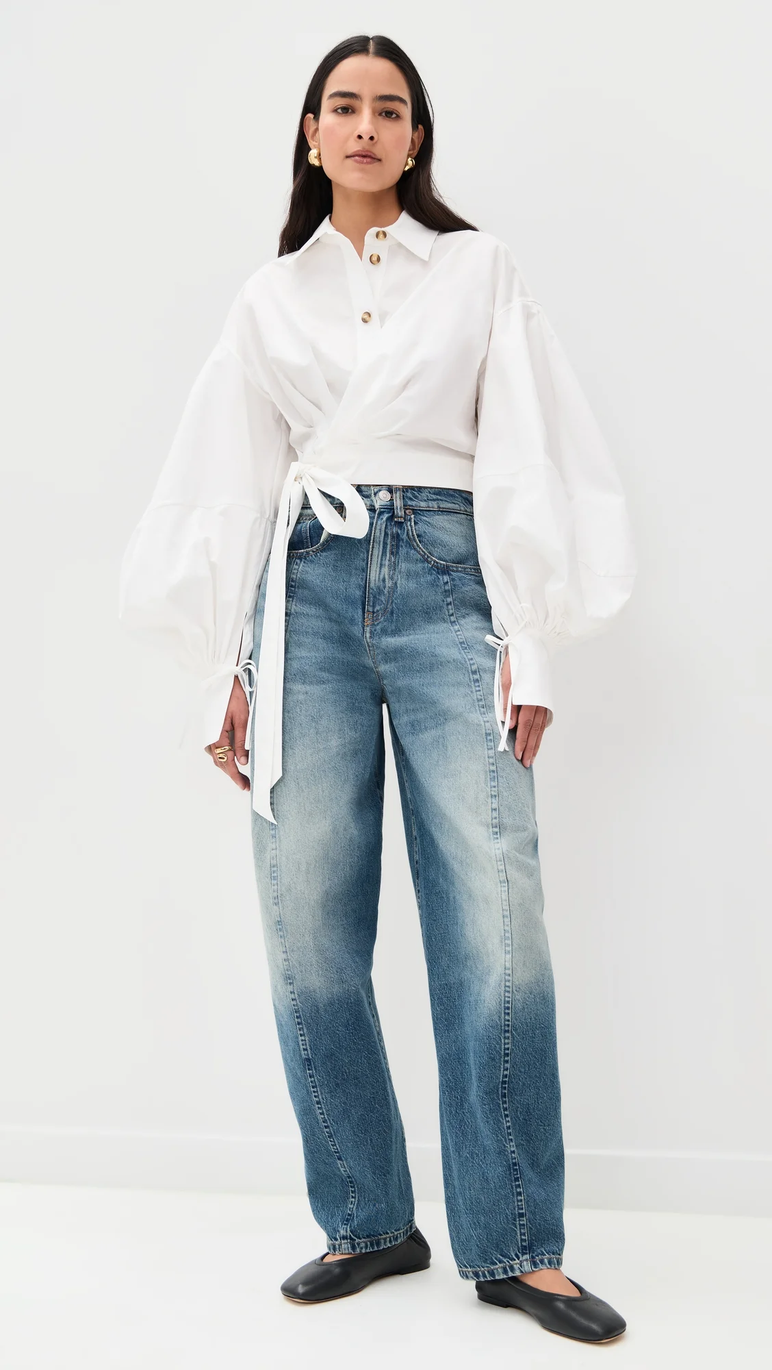 - Fabric: Lightweight, non-stretch poplin weave - Asymmetrical button placket - Pleating at waist and sleeves - Open cuffs with bows - Collared neck - Long puff sleeves - Button placket - Tie at waist - Shell: 100% cotton - Dry clean - Imported, Vietnam Style #ZIMME43480