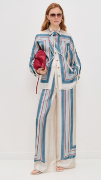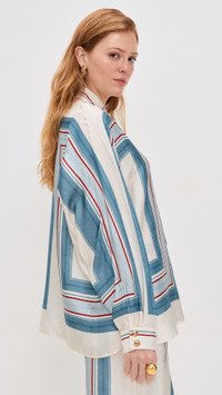 - Fabric: Lightweight, non-stretch silk satin - Optional scarf tie at neckline - Stripe print - Collared neck - Long sleeves with button cuffs - Button placket - Shell: 100% silk - Dry clean - Imported, China Style #ZIMME43460 Size & Fit Model measurements: Size 0: Haley (5'9.5") usually wears size 0 Measurements from size 0 Length: 27.5in / 70.0cm, from shoulder