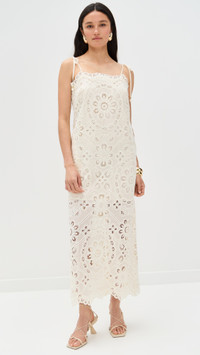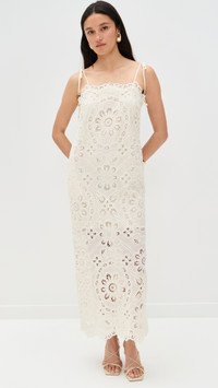 - Fabric: Mid-weight, non-stretch eyelet - Lace trim - Scalloped edges - Back slit - Square neckline - Adjustable tie shoulder straps with beaded accents - Hidden zip at back - On-seam side pockets - Shell: 100% cotton - Lined - Lining: 100% cotton - Dry clean - Imported, China Style #ZIMME43294