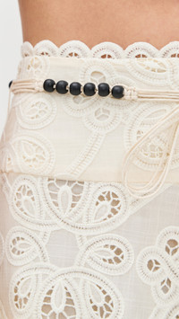 - Fabric: Lightweight, non-stretch eyelet - Scalloped trim - Hook-and-eye and hidden zip at back - Tie self-belt with wooden bead accents - Shell: 100% cotton - Lined - Lining: 100% cotton - Dry clean - Imported, China Style #ZIMME43336 Size & Fit Customers say: Runs large; please size down. Model measurements: Size 0: Isabella (5'9") usually wears size 0 Measurements from size 0 Length: 35.5in / 90.0cm