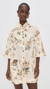 - Fabric: Mid-weight, non-stretch linen - Nautical toile print - Gold-tone nautical buttons - Side vents at hem - Mini length - Collared neck - Short sleeves - Button placket - On-seam side pockets - Shell: 100% linen - Unlined - Dry clean - Imported, China Style #ZIMME43471 Size & Fit Model measurements: Size 0: Cher (5'11") usually wears size 0 Measurements from size 0 Length: 33in / 84.0cm, from shoulder