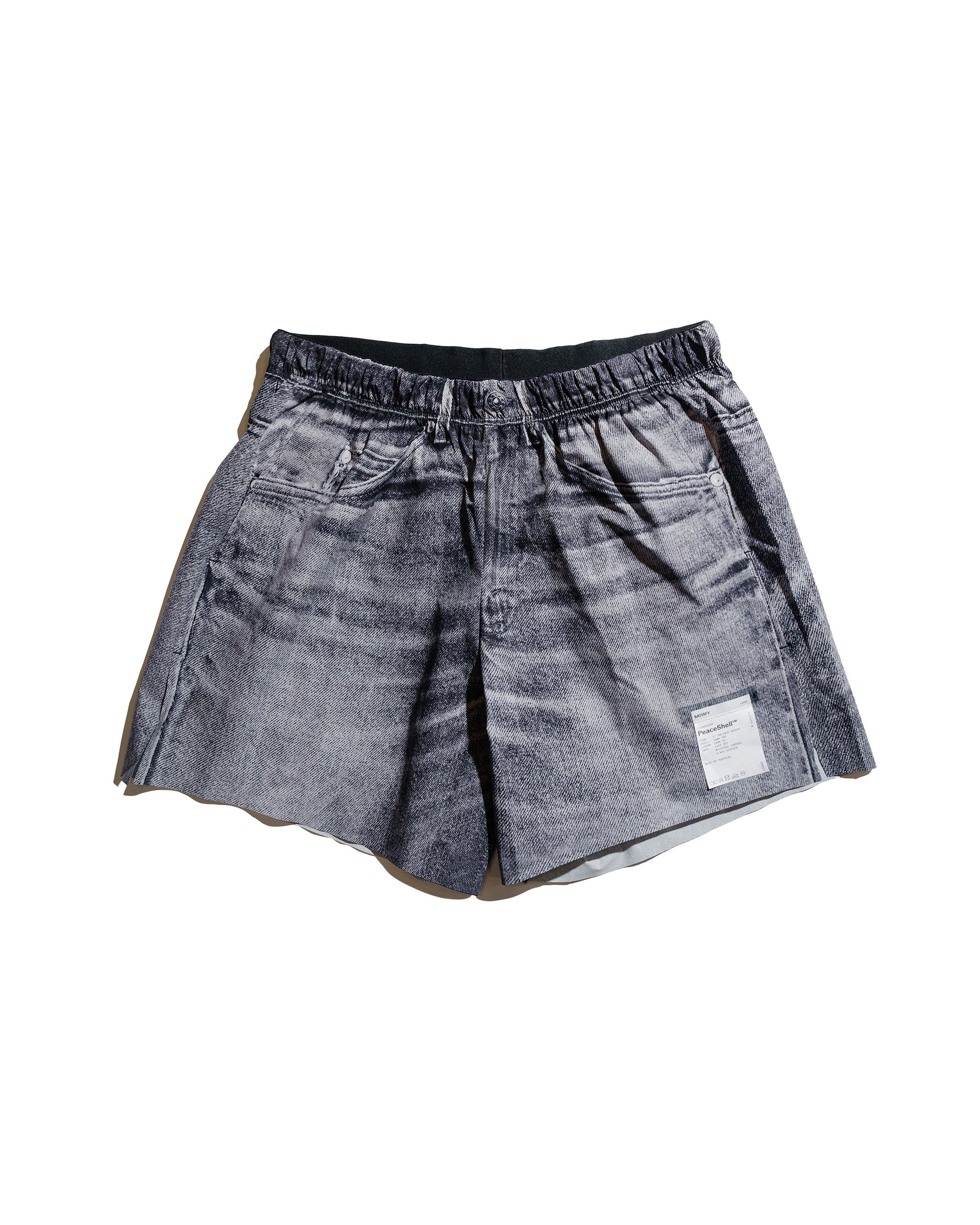 "Denim" shorts for running. These 5” shorts are made from PeaceShell™, a fabric tough enough to survive your life but light enough to make you wonder if you’re actually wearing anything at all. No liner, because why limit yourself? Layer them over tights in winter, wear them solo for comfort, or simply admire their effortless versatility while you sit and pretend you’re about to run." DETAILS - Lightweight & fast-drying PeaceShell™ plain-weave from Japan with vintage denim digital print - 4 way stretch, UV-resistant & moisture-wicking - 2 front side pockets & zippered sweat-proof back pocket - ©SATISFY reflective print - Exterior detachable care label - 86 grams - 100% polyester - Made in Portugal - Model is 6’2” (189cm), 160lbs (73kg) and wearing L