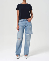 The Amryn Jean in Regenerative Cotton in the color Release by Agolde is a full-length denim pant that features a high-rise straight fit, reworked deconstruction details, and frayed hems for a lived-in edge. Your perfect denim jean with a rigid twist. - Material : 100% Regenerative Cotton - Details: Button Fly. Rigid non stretch. - Sizing: Model is 5'10" and is wearing a size 27. Rise: 11 3/4" Inseam: 32" Leg Opening: 24" - Fit: True to size. Straight fit. - Style it with: An oversized T-shirt and ballet flat. - Made in USA with imported materials - Care: Machine wash cold inside out with like colors. Do not bleach. Tumble dry low. - #A272-1206-RLSN