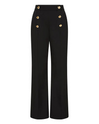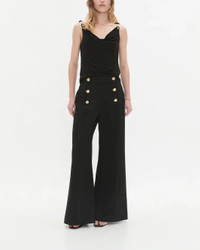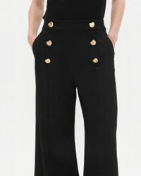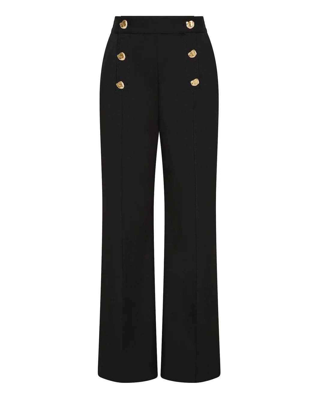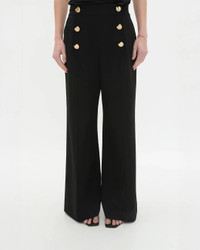 The Gabrielle Pant in Black by Aje is a tailored paint, high-waisted pant featuring sailor closure with button detail, and a pintuck detail at the leg. Perfect for daytime workwear into evening, dinner plans with the change of a shoe or top. Model wears a size AU 8/S - 67% Polyester, 29% Rayon, 4% Spandex - Wide leg Silhouette, front pockets, Zip, hook and eye closure. - Unlined - Dry Clean Only - Style it with the Leah Knit Halter Top for a monochromatic, sleek look. - #25SS3082